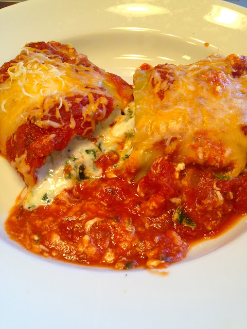 Preheat oven to 350. Combine spinach, ricotta (or cottage cheese), parmesan, egg, and salt and pepper in a medium bowl. Place dried lasagna noodles on wax paper. Spread 1/3 cup of spinach mixture on top of noodles. Then, carefully roll up noodles and place in casserole dish. Continue with each noodle. Top with tomato sauce and cheese. Bake for about 30-40 minutes or until cheese is melted.